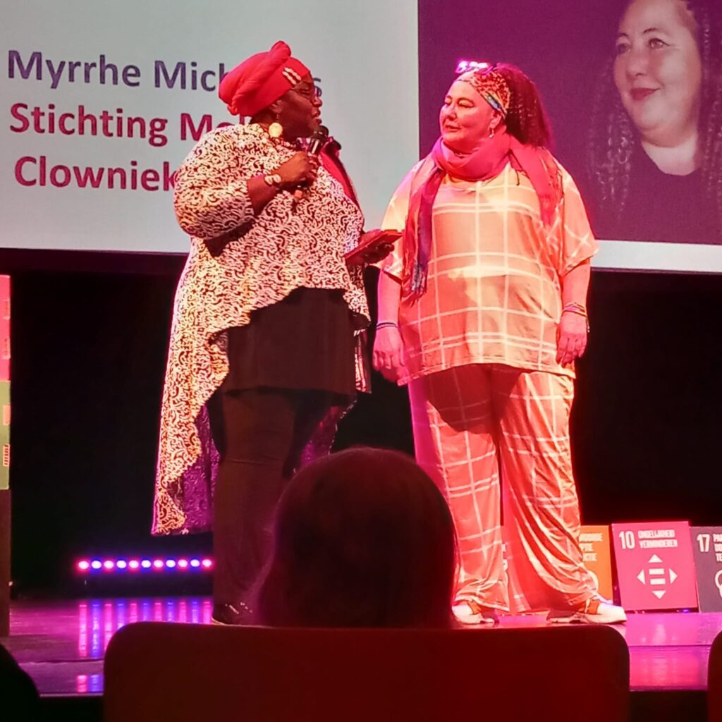 Winnaar van de 8 maart power award 2025 aan Myrrhe Michorius uit handen van de juryvoorzitter Cheraldine Osepa.
